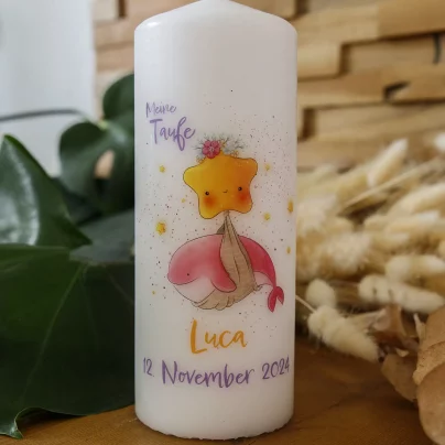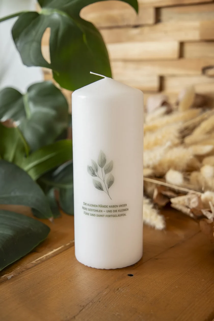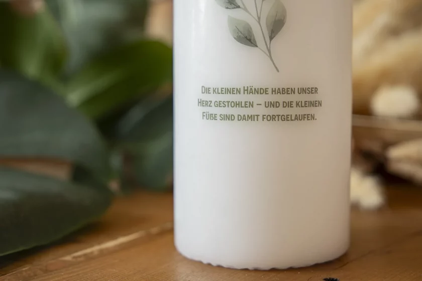 Das zauberhafte Babynashorn-Motiv, umrahmt von zarten Blumen, wird sorgfältig auf die Kerze gedruckt und strahlt Wärme und Geborgenheit aus. Die sanften Farben und das niedliche Design machen sie zur idealen Dekoration für das Babyzimmer oder als Teil eines liebevoll gestalteten Geschenkkorbs zur Geburt.