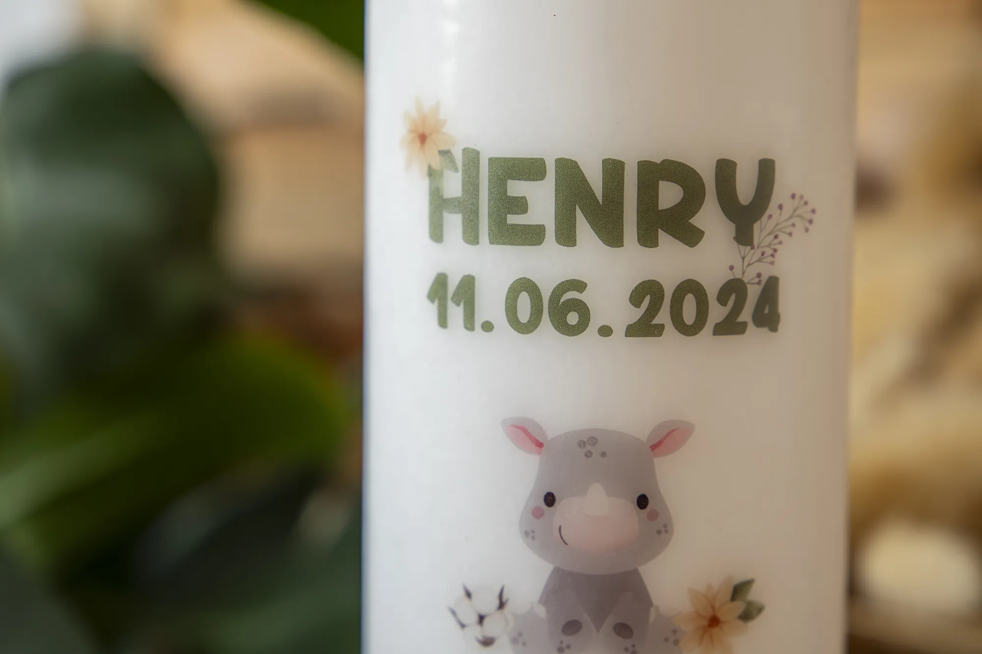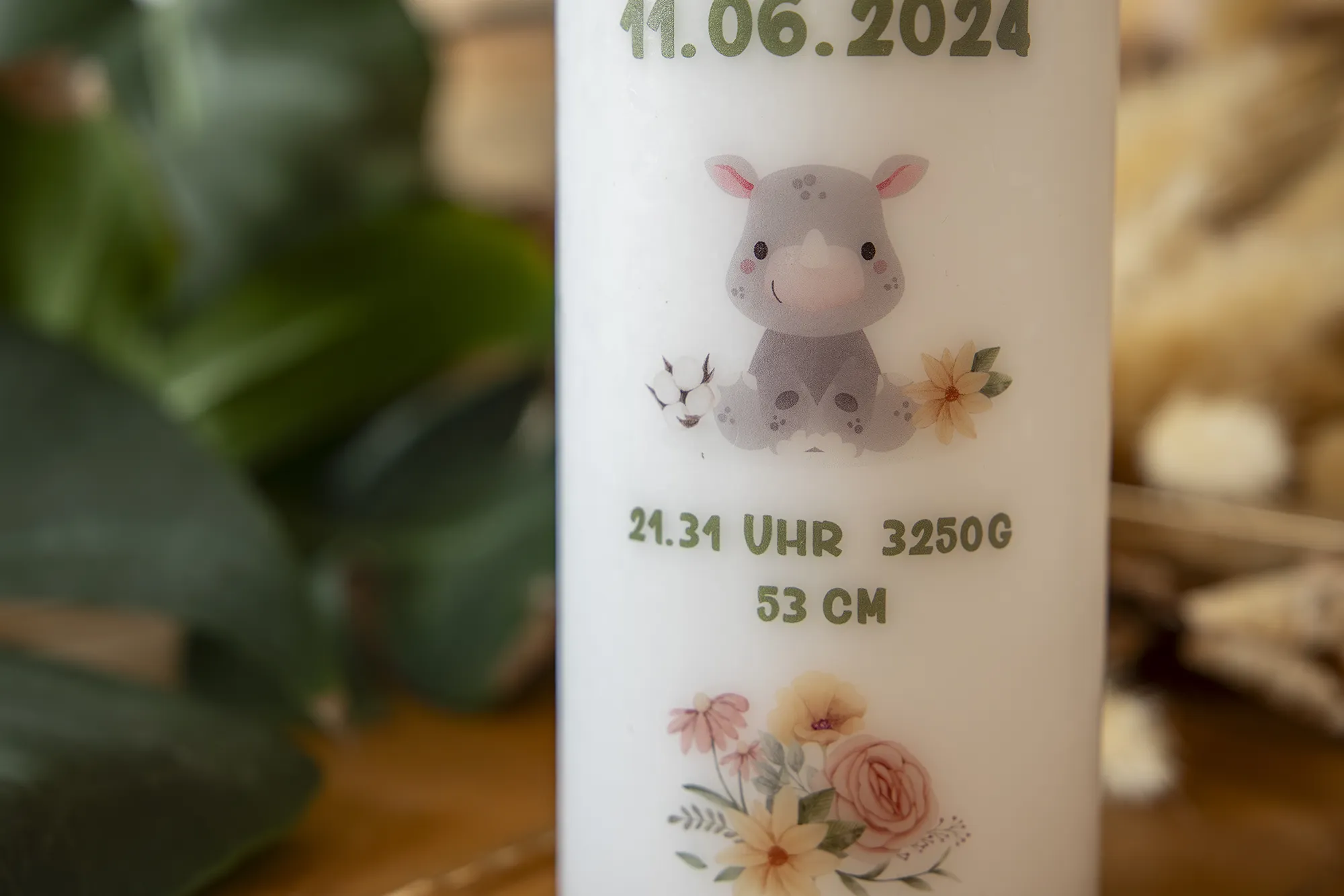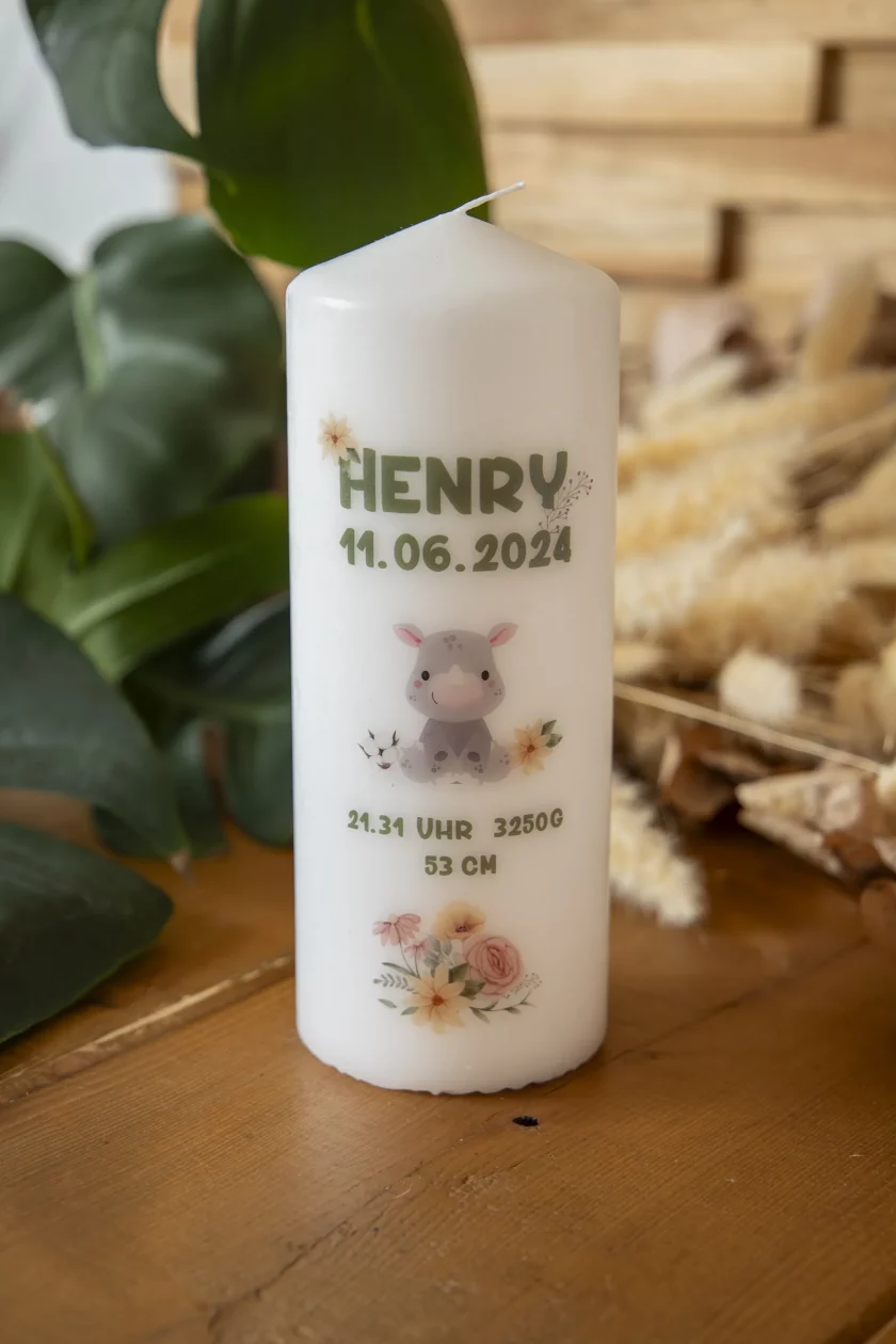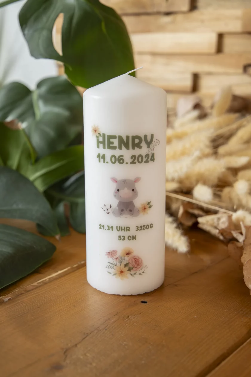 Babynashorn Floral Geburtskerze individuell personalisiert