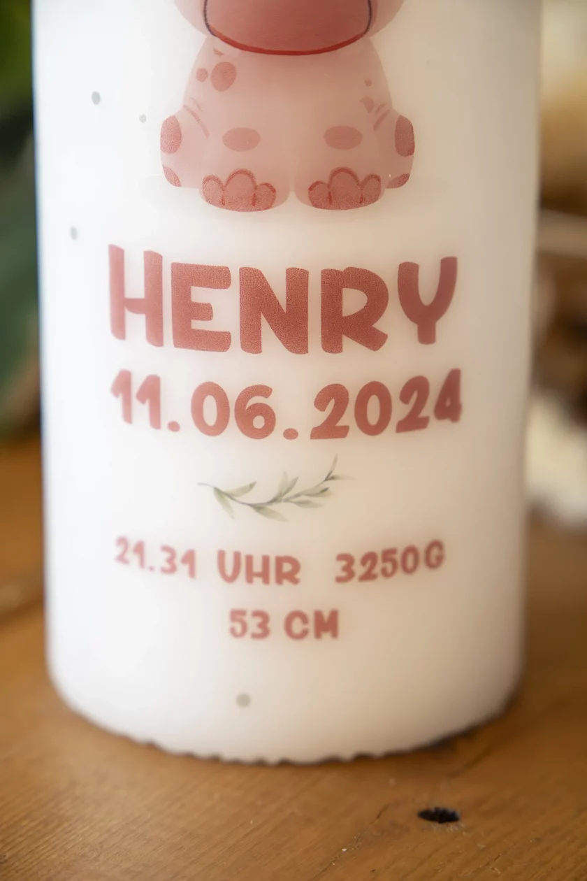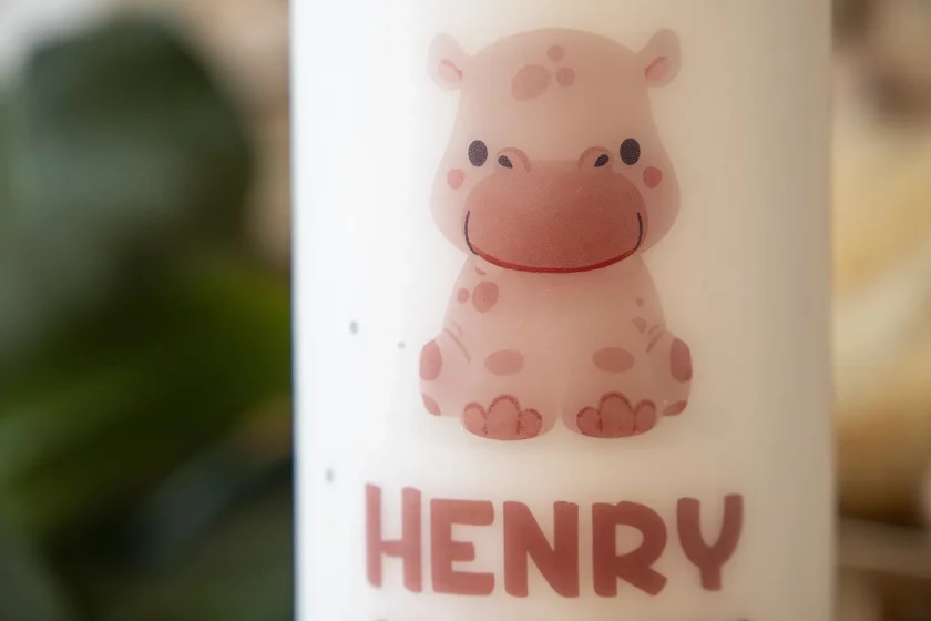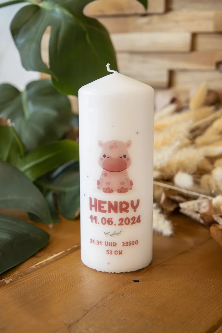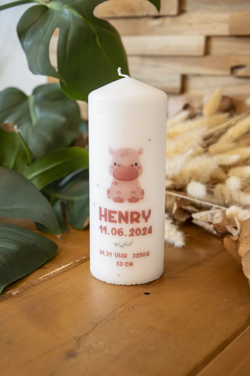 Das Design der “Babynilpferd Floral 360°” Geburtskerze erstreckt sich über die gesamte Kerzenoberfläche und zeigt ein niedliches Babynilpferd, umgeben von zarten Blumen und Blättern. Diese liebevoll gestaltete Kerze symbolisiert die Unschuld und das Wachsen des neugeborenen Kindes und ist ein wunderschönes Erinnerungsstück, das den besonderen Moment der Geburt für immer festhält.