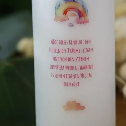 Das Design der “Elefant Konfetti 360°” Geburtskerze erstreckt sich über die gesamte Oberfläche der Kerze und zeigt einen entzückenden Elefanten, umgeben von buntem Konfetti, das für die Feier des neuen Lebens steht. Die fröhlichen Farben und das verspielte Muster machen diese Kerze zu einem Highlight in jedem Kinderzimmer und symbolisieren die Freude und Aufregung, die mit der Geburt eines Kindes einhergeht.