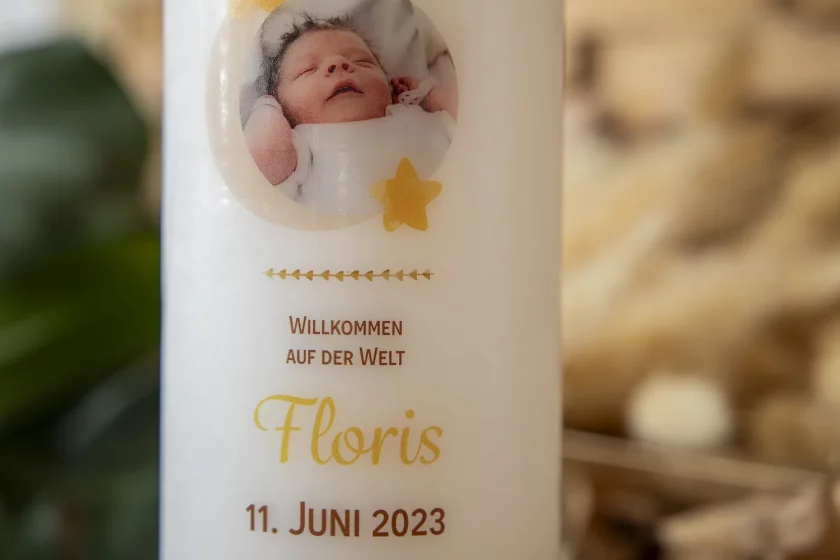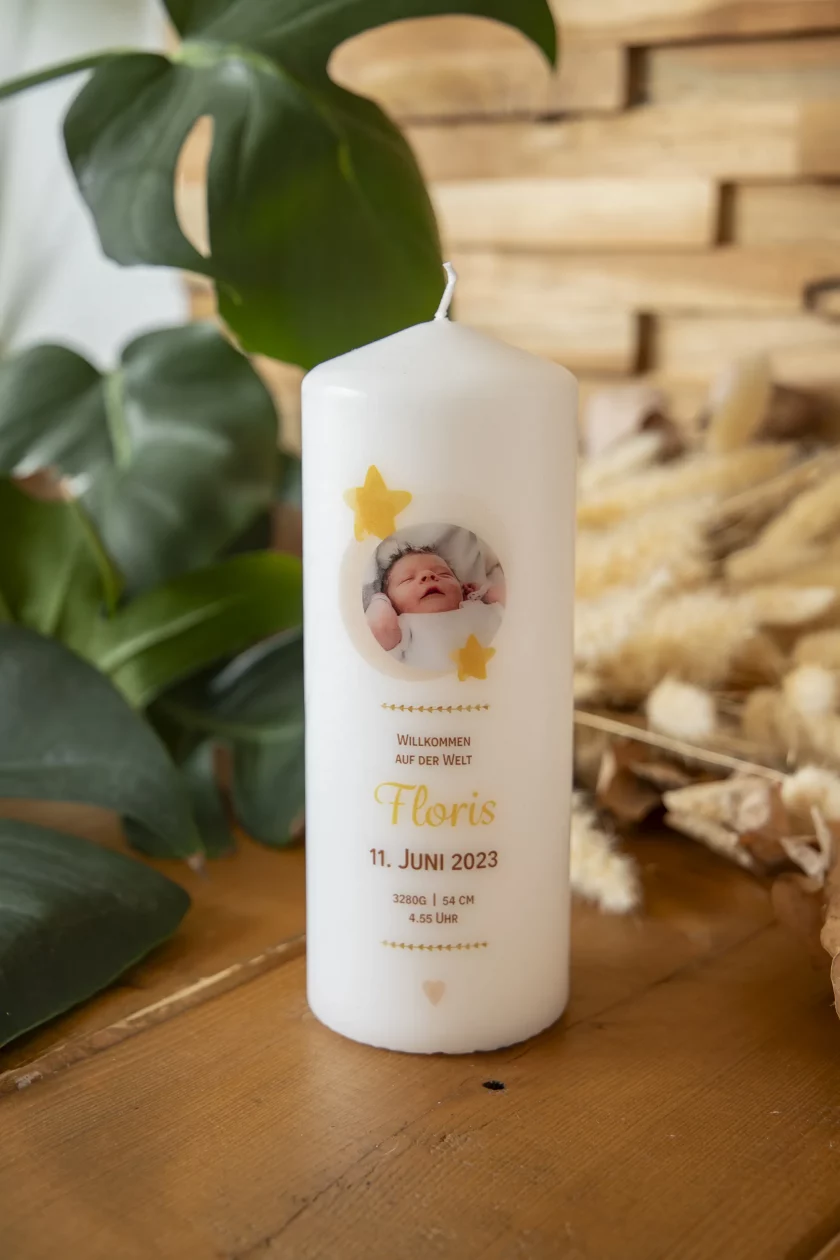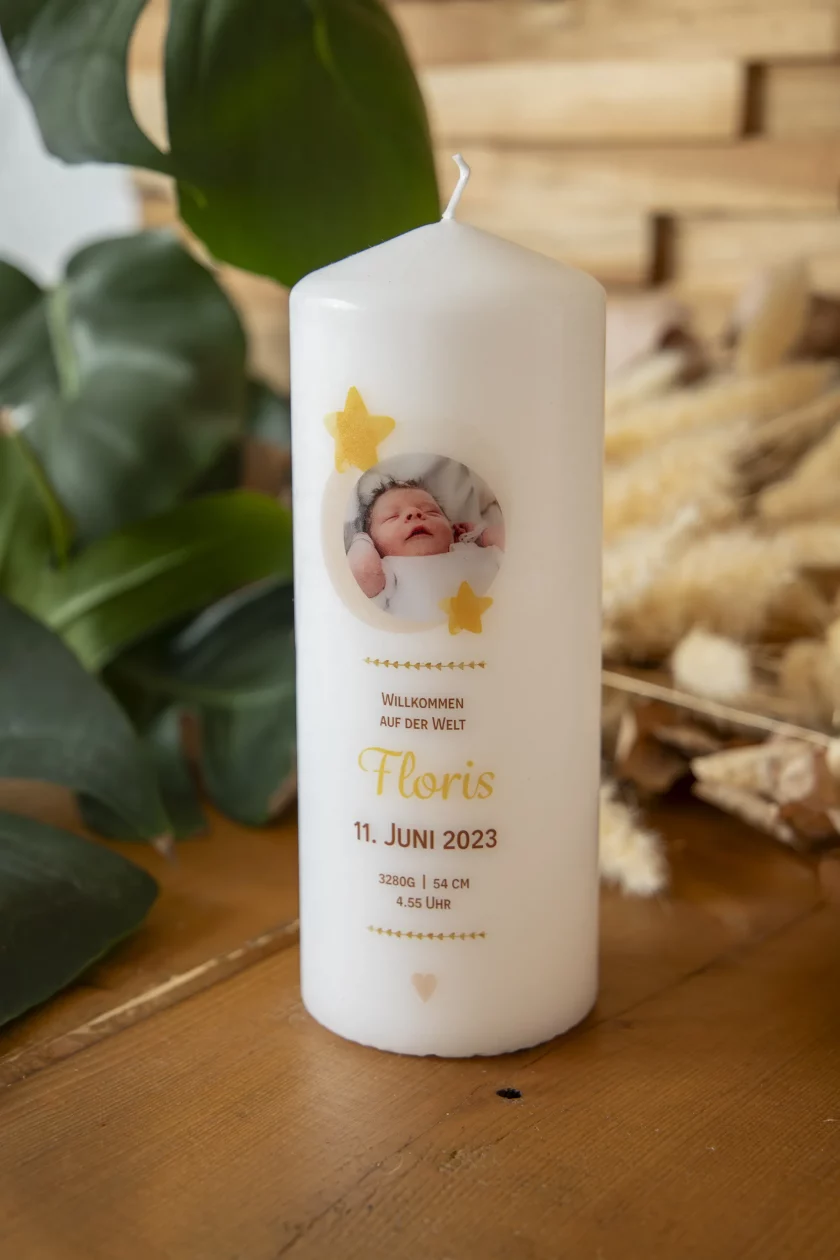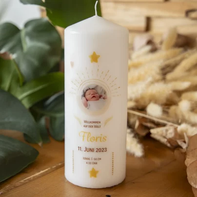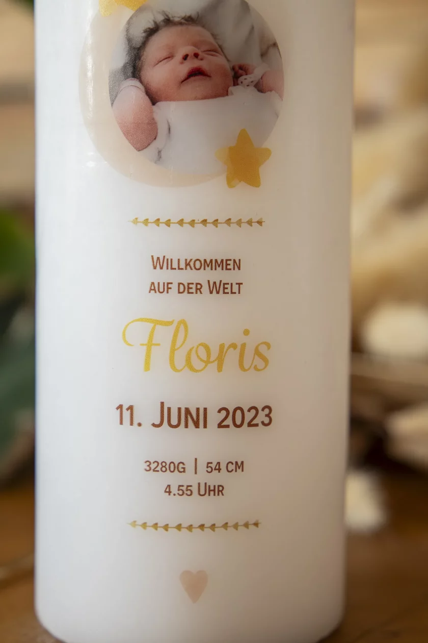 Das zarte Motiv zeigt ein herzförmiges Bild, umrahmt von funkelnden Sternen, die den unendlichen Himmel und die grenzenlose Liebe symbolisieren, die das neugeborene Kind umgibt. In sanften Pastelltönen gehalten, fügt sich diese Kerze harmonisch in jedes Kinderzimmer ein und bleibt als wertvolles Erinnerungsstück an den besonderen Moment der Geburt erhalten.