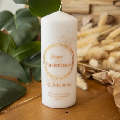 Das schlichte, aber dennoch beeindruckende Design zeigt zarte, grüne Blätter, die in harmonischen Tönen gestaltet sind und sich perfekt in eine naturverbundene oder moderne Hochzeitsdekoration einfügen. Die “Green Leaf” Hochzeitskerze eignet sich ideal als dekoratives Element für Ihre Zeremonie oder als Tischdekoration bei der Feier und bleibt als bleibendes Andenken an Ihren besonderen Tag erhalten.