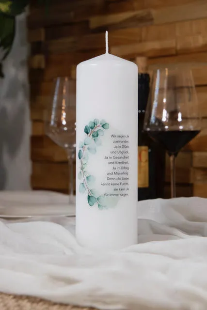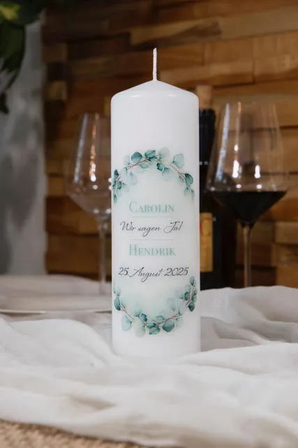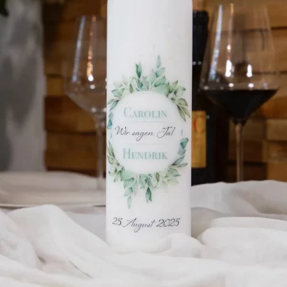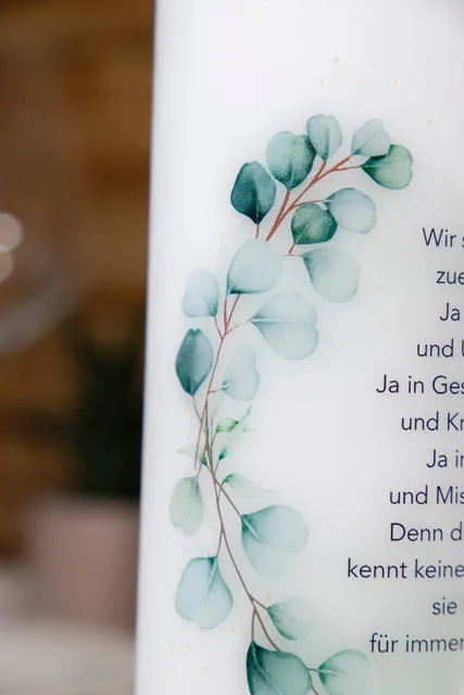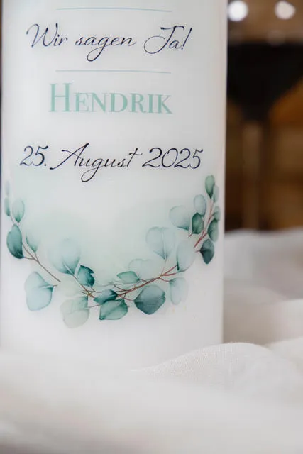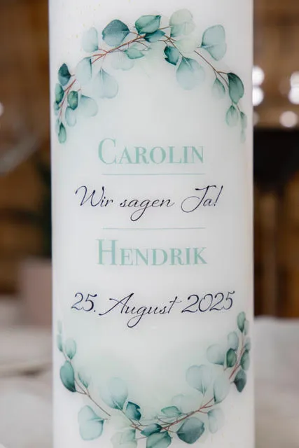 Unsere elegante „Greenery Eukalyptus“ Hochzeitskerze kombiniert zarte Eukalyptuszweige mit einem modernen, natürlichen Design – perfekt für eine stilvolle und zeitlose Hochzeitszeremonie. Die frischen Grüntöne stehen für Beständigkeit, Frieden und Wachstum und verleihen jeder Feier eine harmonische Atmosphäre.