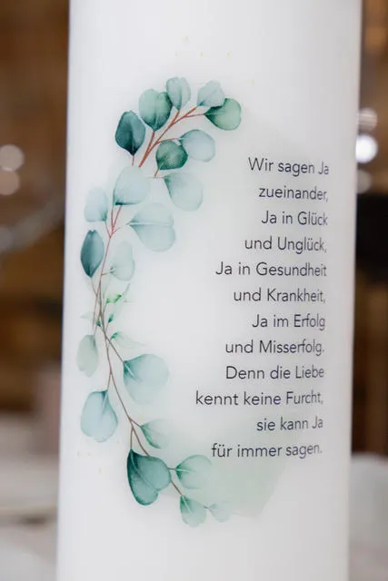 Mit der Möglichkeit zur individuellen Personalisierung – sei es mit Namen, Hochzeitsdatum oder einer persönlichen Botschaft – wird diese Kerze zu einem einzigartigen Erinnerungsstück. Hergestellt aus hochwertigem Wachs, eignet sie sich ideal als Traukerze, stilvolle Tischdekoration oder als liebevolles Geschenk für das Brautpaar.