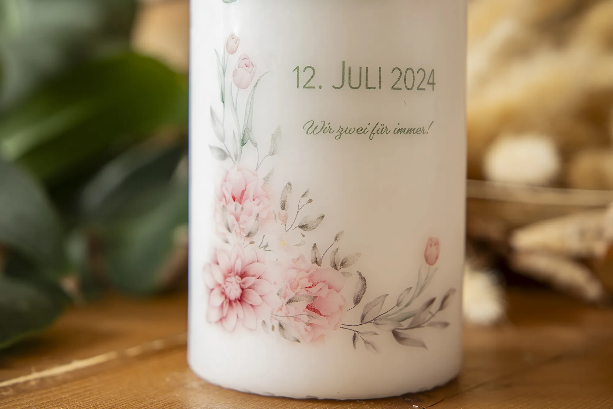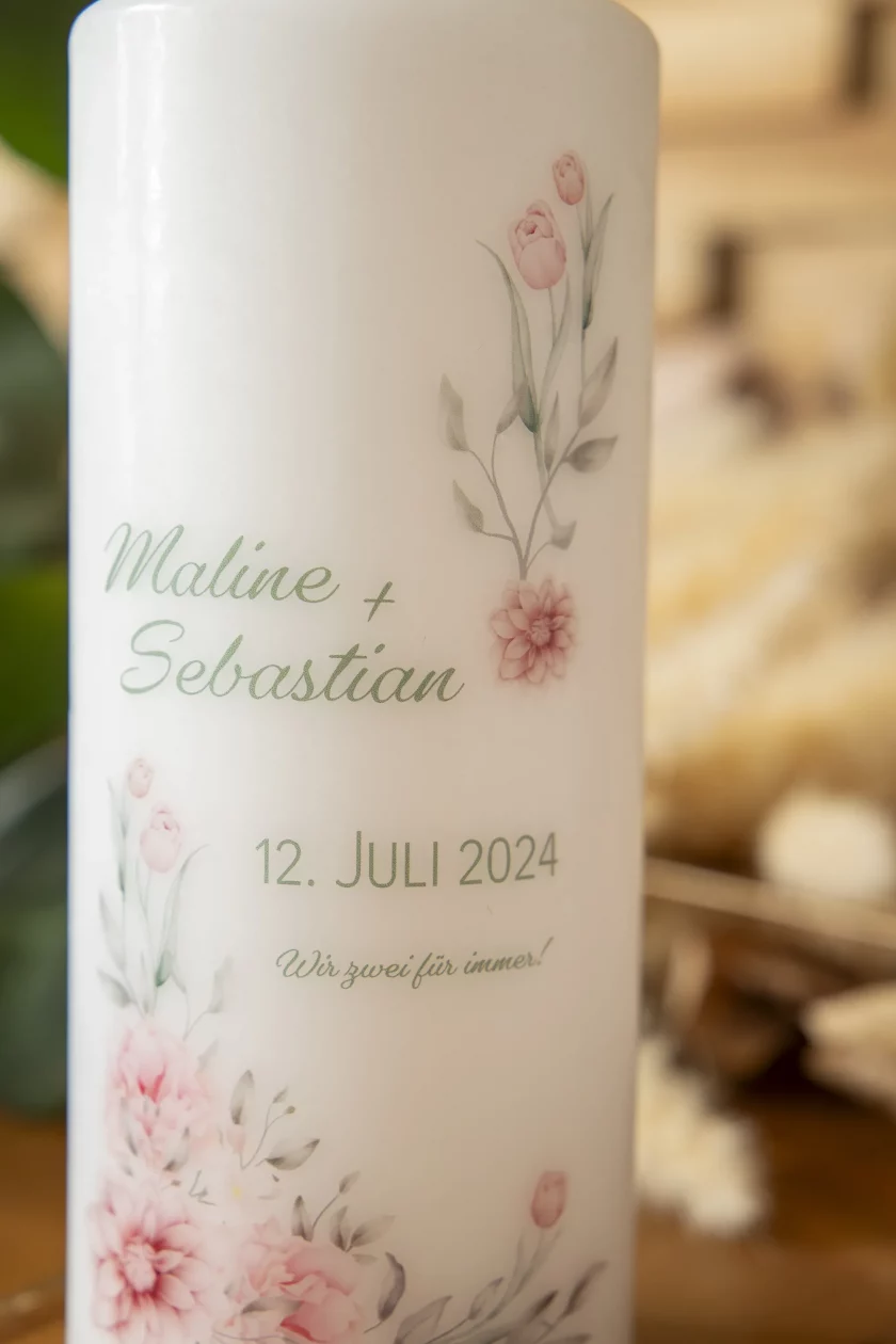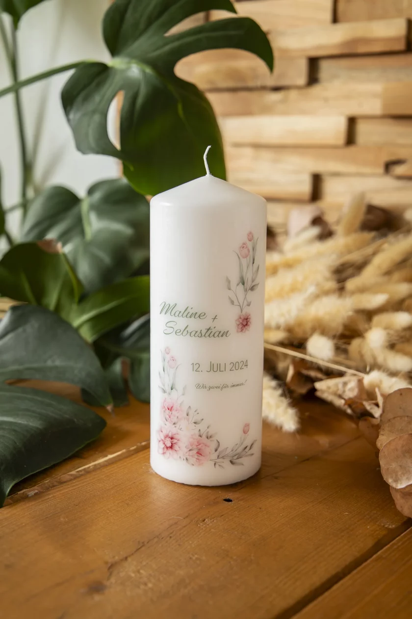 Das Rosenmotiv, zart und detailreich gestaltet, symbolisiert die Schönheit und die blühende Liebe, die Sie an Ihrem besonderen Tag feiern. Die Kombination aus Grün und Rosa verleiht der Kerze eine frische, lebendige Ausstrahlung, die sowohl auf dem Altar als auch auf den Tischen Ihrer Hochzeitsfeier ein elegantes Statement setzt.