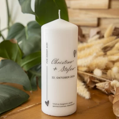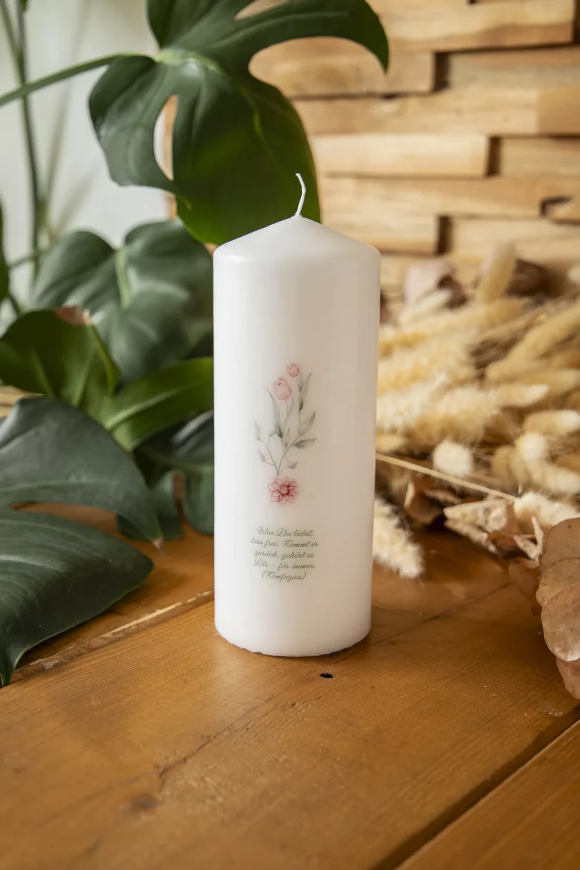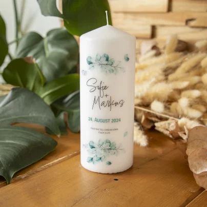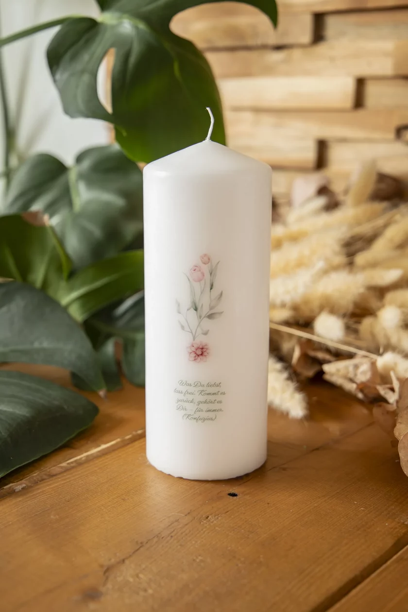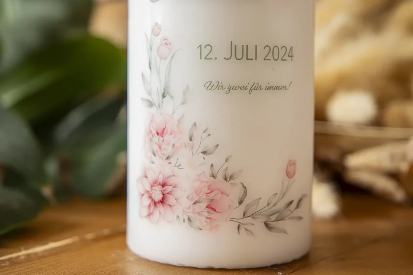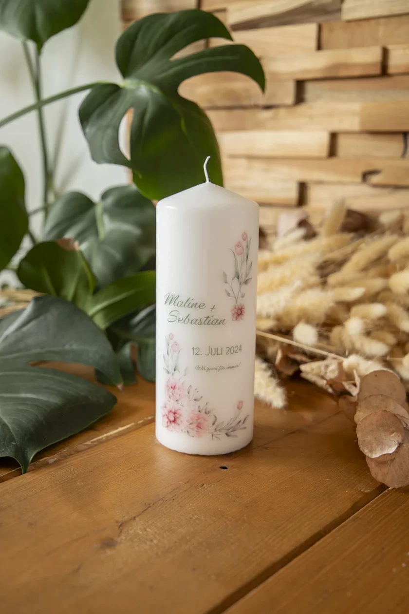 Das Rosenmotiv, zart und detailreich gestaltet, symbolisiert die Schönheit und die blühende Liebe, die Sie an Ihrem besonderen Tag feiern. Die Kombination aus Grün und Rosa verleiht der Kerze eine frische, lebendige Ausstrahlung, die sowohl auf dem Altar als auch auf den Tischen Ihrer Hochzeitsfeier ein elegantes Statement setzt.