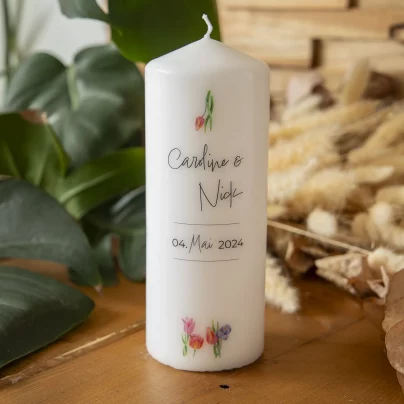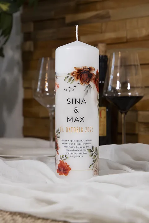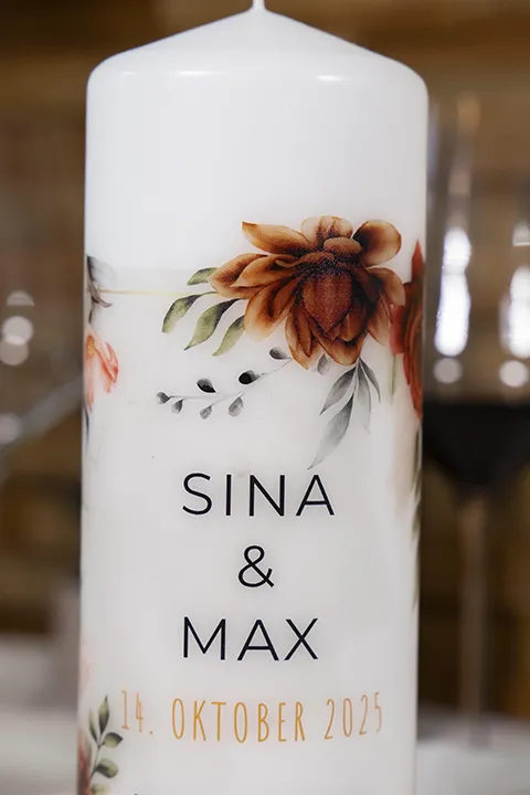 Gefertigt aus erstklassigem Wachs, sorgt sie für eine stimmungsvolle Atmosphäre während der Trauung und bleibt als liebevolles Andenken an den besonderen Tag erhalten. Ob als symbolträchtige Traukerze, stilvolle Tischdekoration oder persönliches Geschenk für das Brautpaar – diese Kerze bringt herbstlichen Charme in jede Hochzeitsfeier.