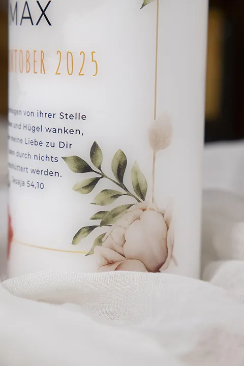 Unsere hochwertig bedruckbare Hochzeitskerze „Herbstrose Herbstfarben“ vereint warme, goldene und rostrote Töne mit romantischen Rosenmotiven – perfekt für herbstliche Hochzeiten. Dank der Möglichkeit zur individuellen Personalisierung mit Namen, Hochzeitsdatum oder einer besonderen Botschaft wird jede Kerze zu einem einzigartigen Erinnerungsstück.
