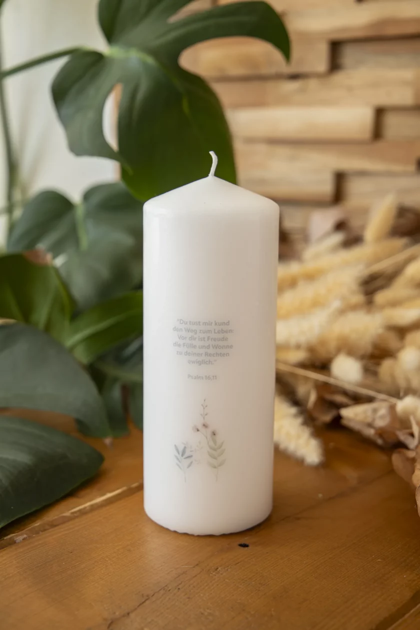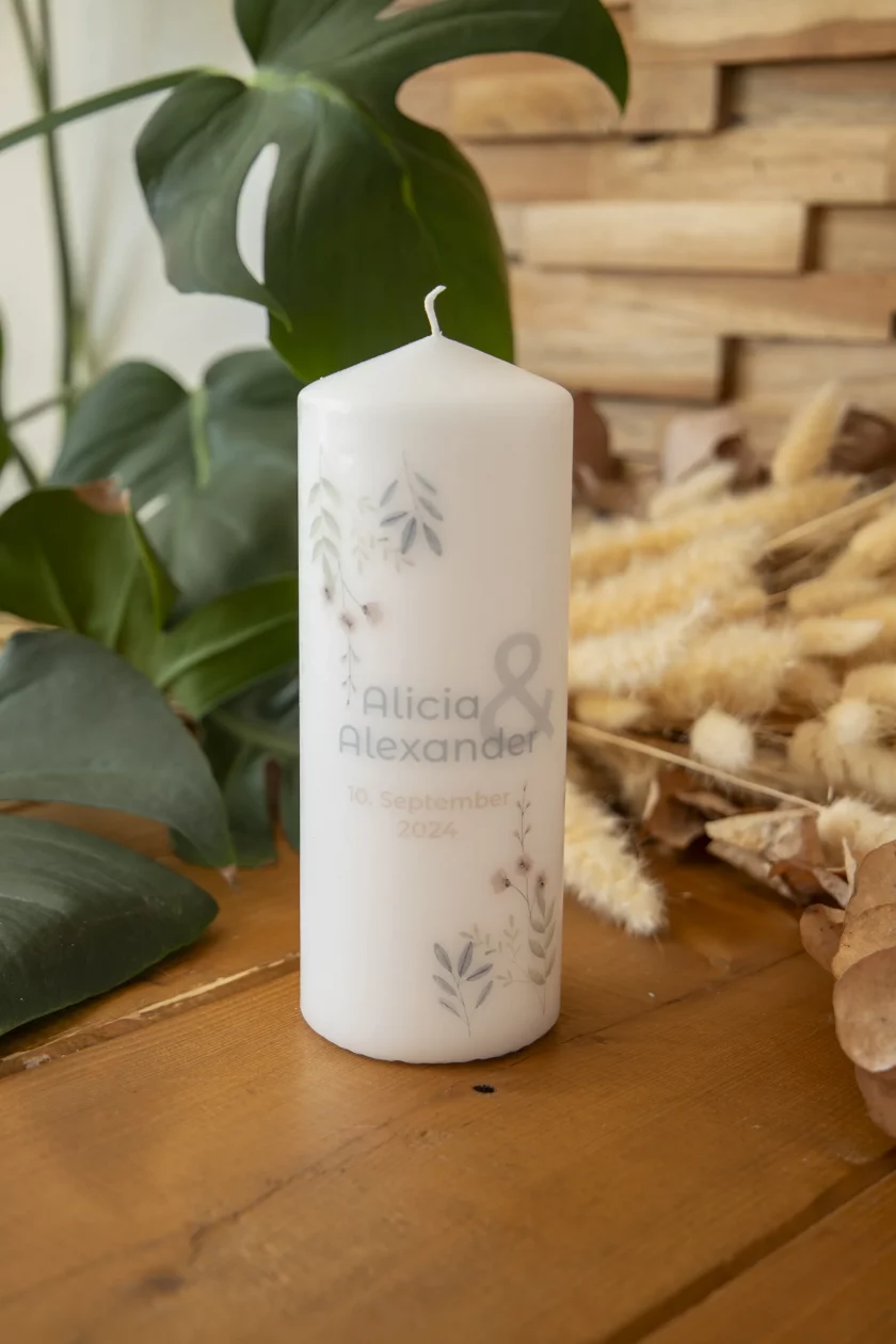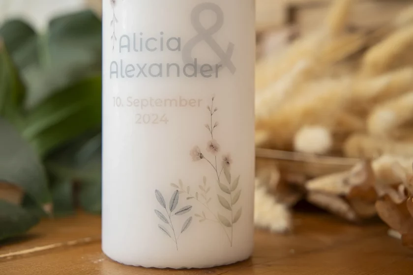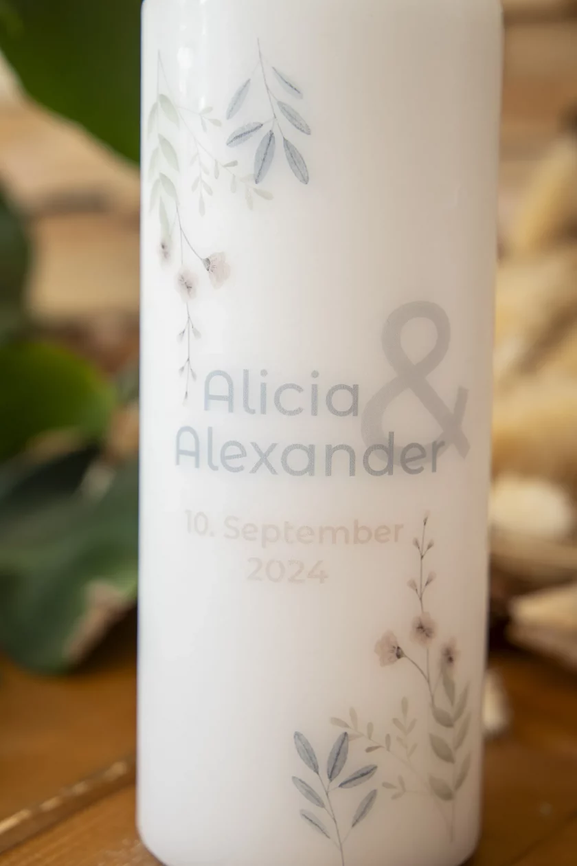 Das filigrane Blumenmotiv, in harmonischen Pastelltönen gehalten, fügt sich nahtlos in jede Hochzeitsdekoration ein und unterstreicht die zarten und liebevollen Aspekte Ihres besonderen Tages. Die “Pastell Floral” Hochzeitskerze ist mehr als nur ein Dekoelement – sie ist ein Erinnerungsstück, das die Emotionen und die Magie Ihres Hochzeitstages einfängt.