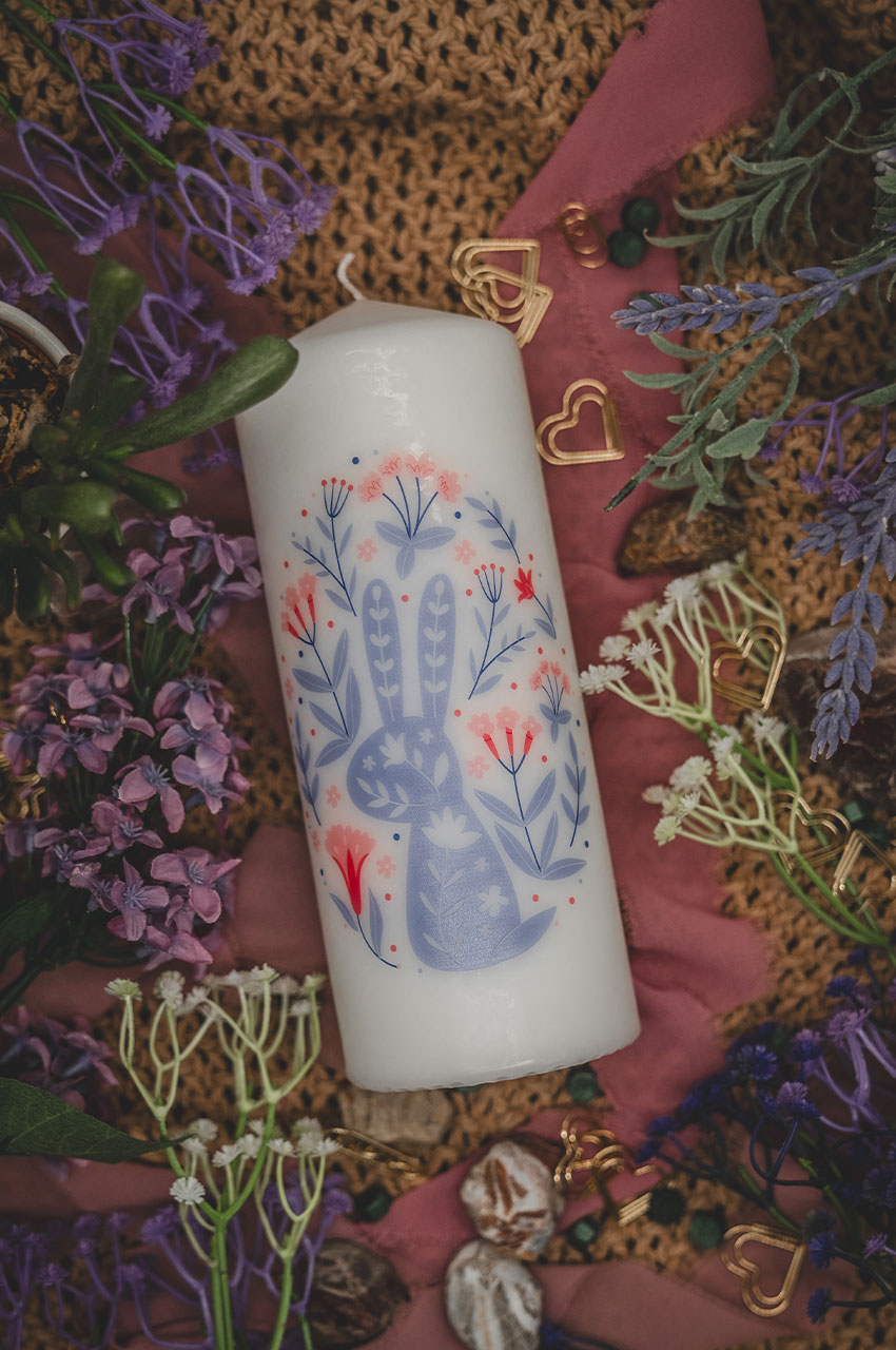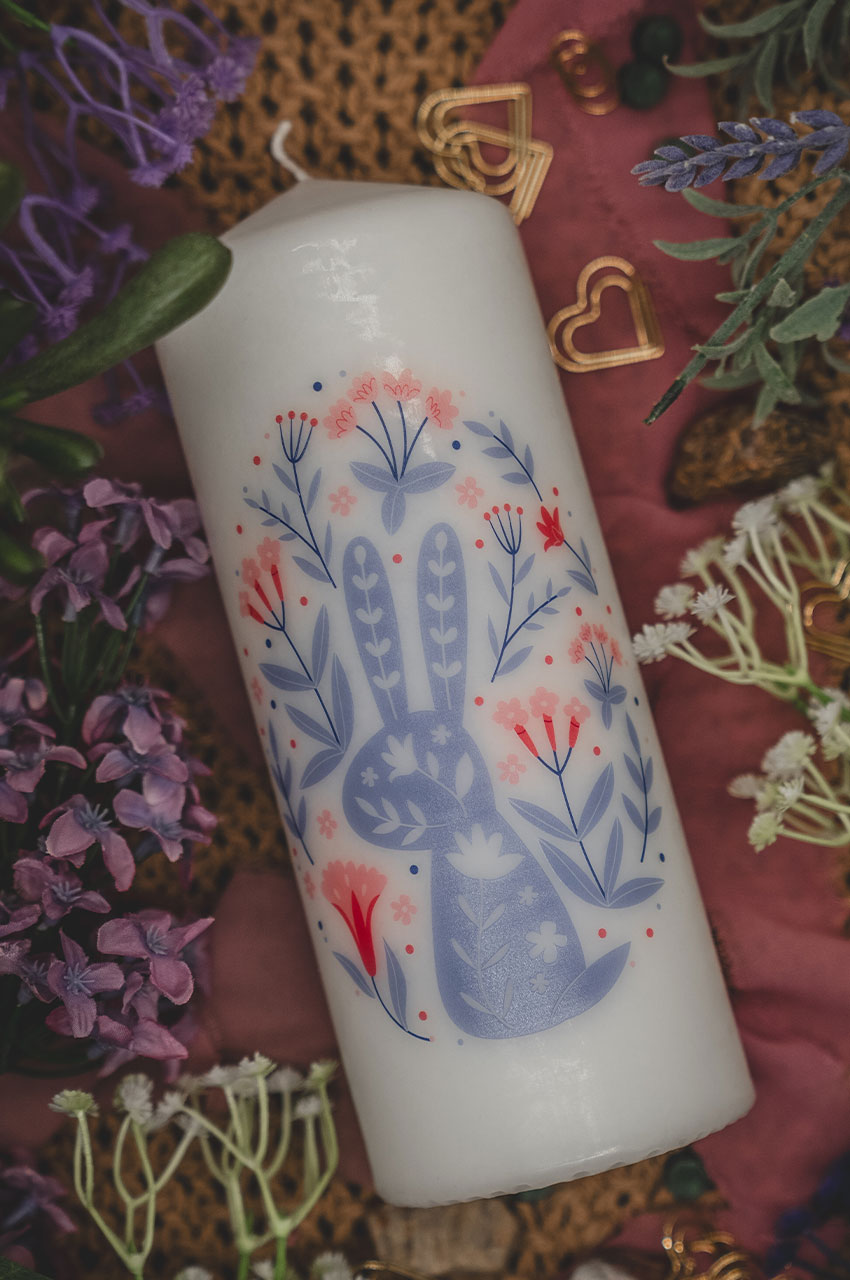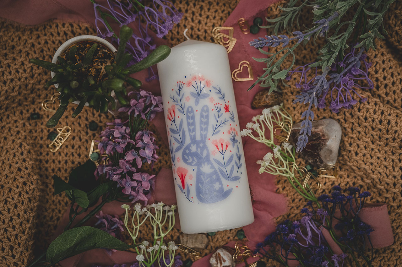 Die „Osterhase Blumen lila“ Osterkerze vereint fröhliche Osterstimmung mit zarten Frühlingsfarben. Das liebevoll gestaltete Hasenmotiv wird von floralen Elementen in sanften Lilatönen ergänzt und sorgt für eine harmonische und zugleich lebendige Ausstrahlung.