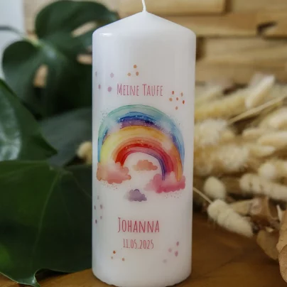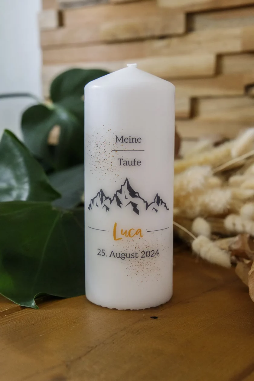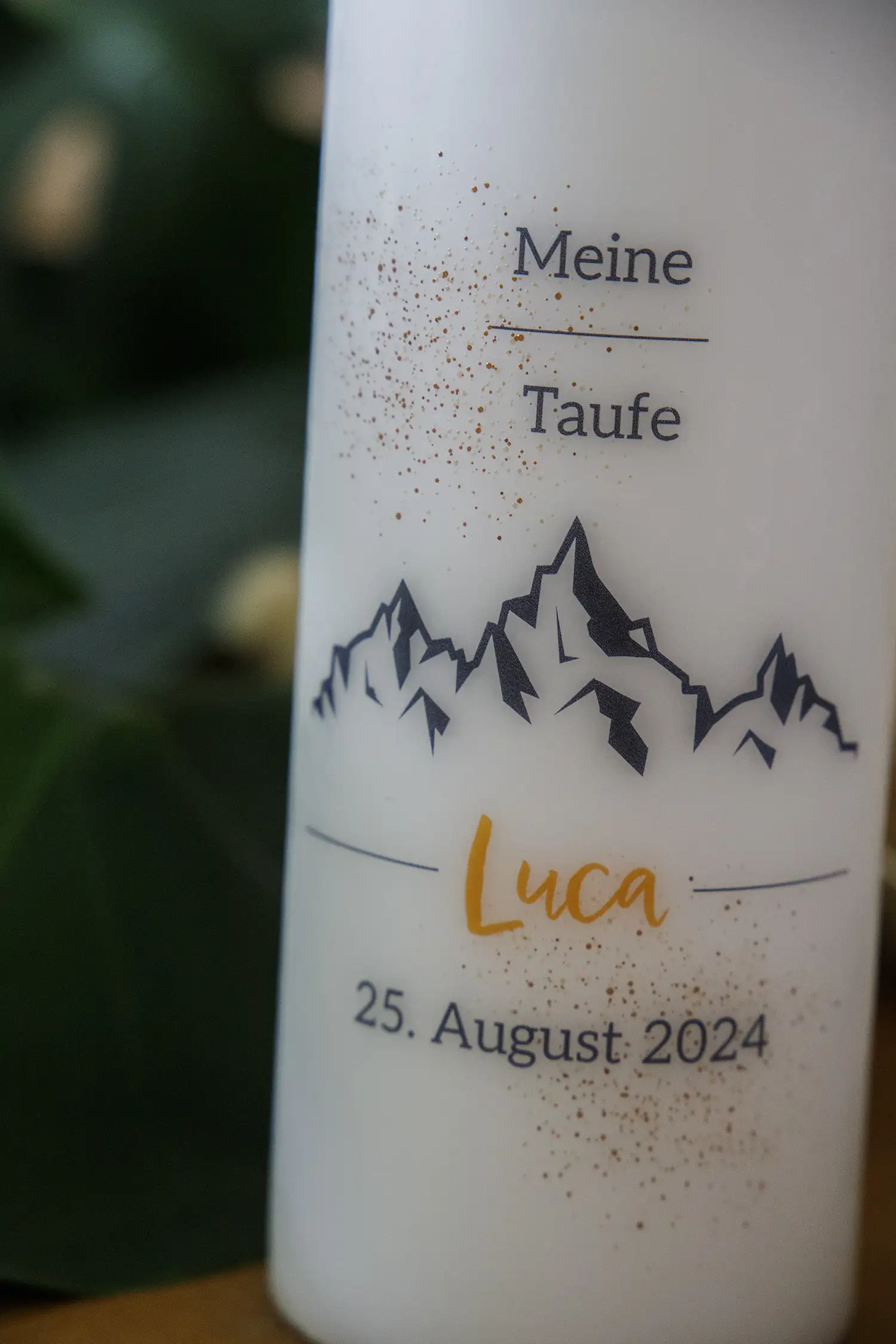 Das Bergmotiv ist in dezenten, natürlichen Farben gehalten und verkörpert die Ruhe und Erhabenheit der Natur. Diese Taufkerze bringt nicht nur symbolisch den Schutz und die Unterstützung des Glaubens in die Zeremonie ein, sondern bleibt auch als wertvolles Andenken an diesen besonderen Tag bestehen.