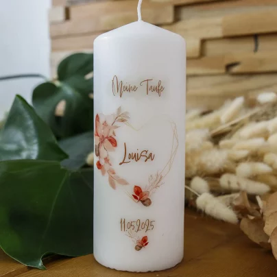 Das filigrane Kirschblütenmotiv, in sanften Pastelltönen gehalten, verleiht dieser Kerze eine elegante und zugleich beruhigende Ausstrahlung. Es spiegelt die Reinheit des Täuflings und die Freude wider, die mit diesem besonderen Tag verbunden ist. Die “Kirschblüte” Taufkerze ist nicht nur ein schönes Dekorationsstück für die Zeremonie, sondern auch ein bleibendes Erinnerungsstück, das den Beginn des spirituellen Lebensweges markiert.