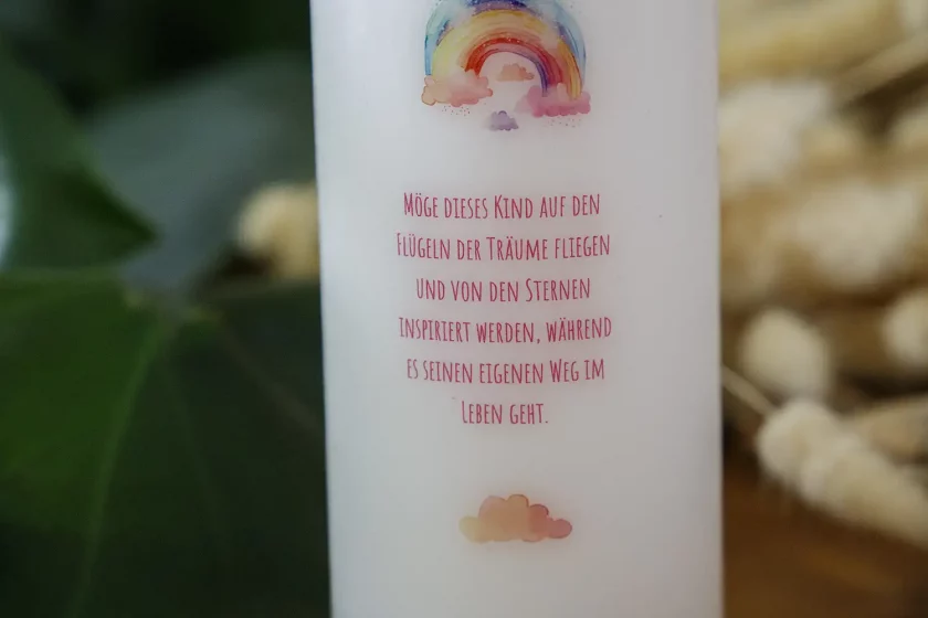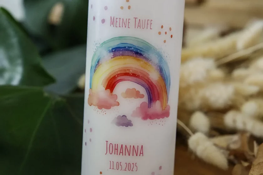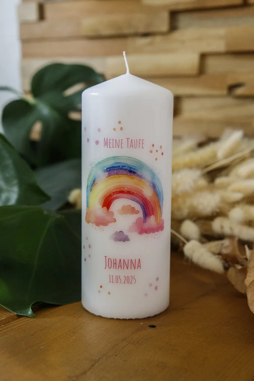 Die Taufe ist ein freudiges und bedeutungsvolles Ereignis, das den Beginn eines neuen, spirituellen Lebensweges markiert. Unsere “Regenbogen” Taufkerze fängt die Schönheit und Symbolik dieses besonderen Moments auf einzigartige Weise ein. Der Regenbogen steht traditionell als Zeichen des Bundes und der Hoffnung – eine Botschaft, die diese Kerze auf wundervolle Weise vermittelt.