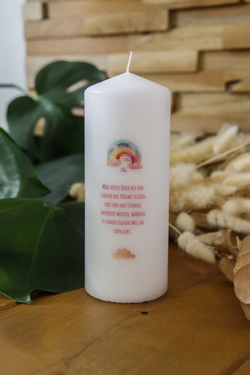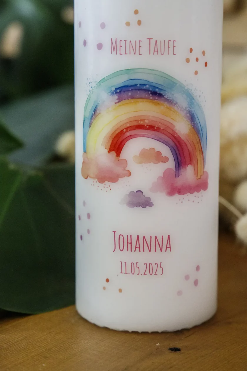 Das liebevoll gestaltete Regenbogenmotiv erstrahlt in sanften, harmonischen Farben und wird durch feine Details und stilvolle Verzierungen ergänzt. Diese Taufkerze bringt Farbe und Licht in die Zeremonie und bleibt als ein wertvolles Andenken, das diesen besonderen Tag für immer im Gedächtnis behält.