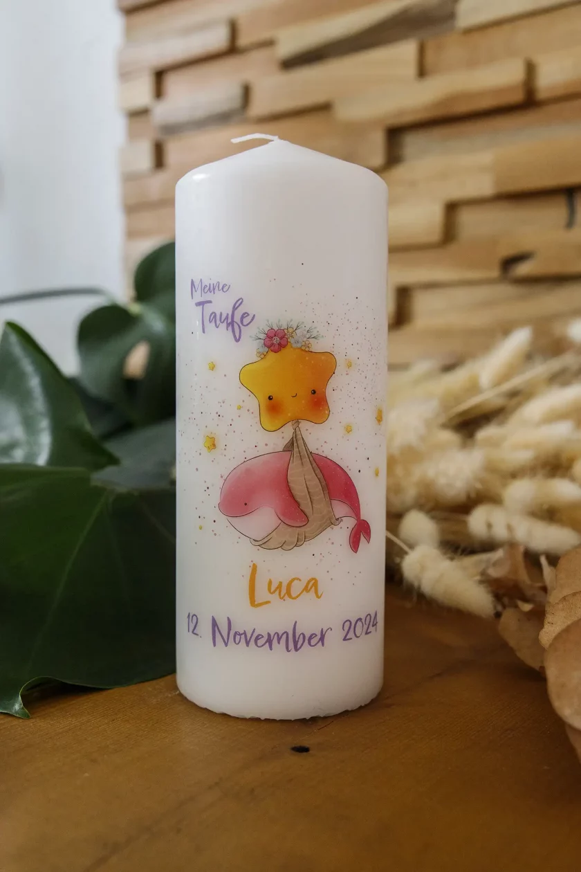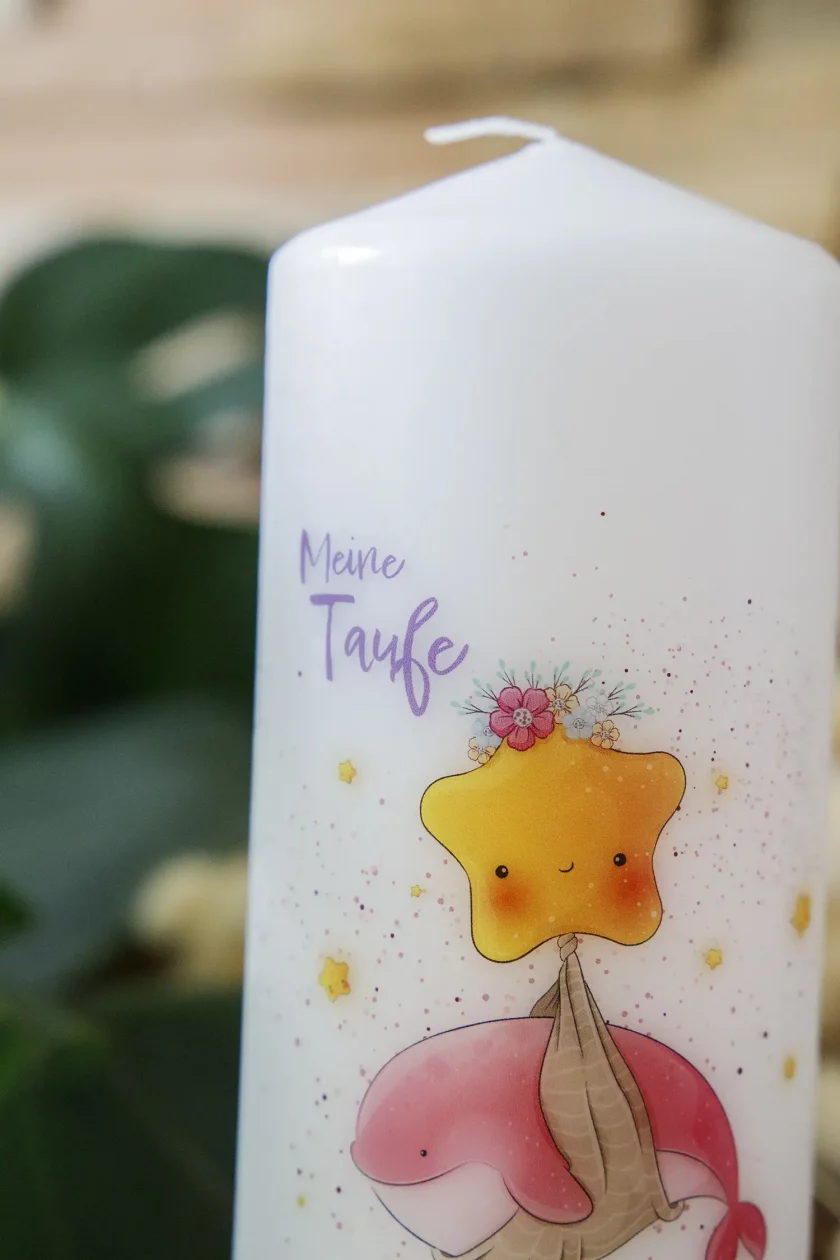 Das zarte Stern-Motiv steht sinnbildlich für die Führung und den Schutz, den das Taufkind auf seinem Lebensweg erfahren wird. Umgeben von stilvollen Akzenten und in harmonischen Farben gehalten, ist diese Kerze ein wunderschönes Andenken an den bedeutenden Tag der Taufe.