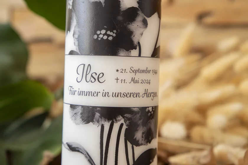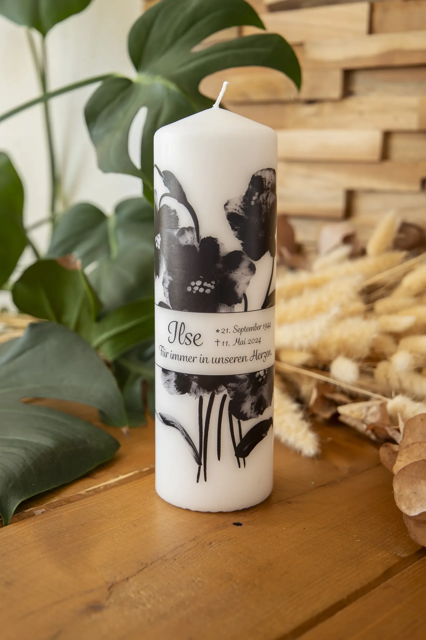 Schwarze Blätter Trauerkerze Kondulenzkerze individuell personalisiert