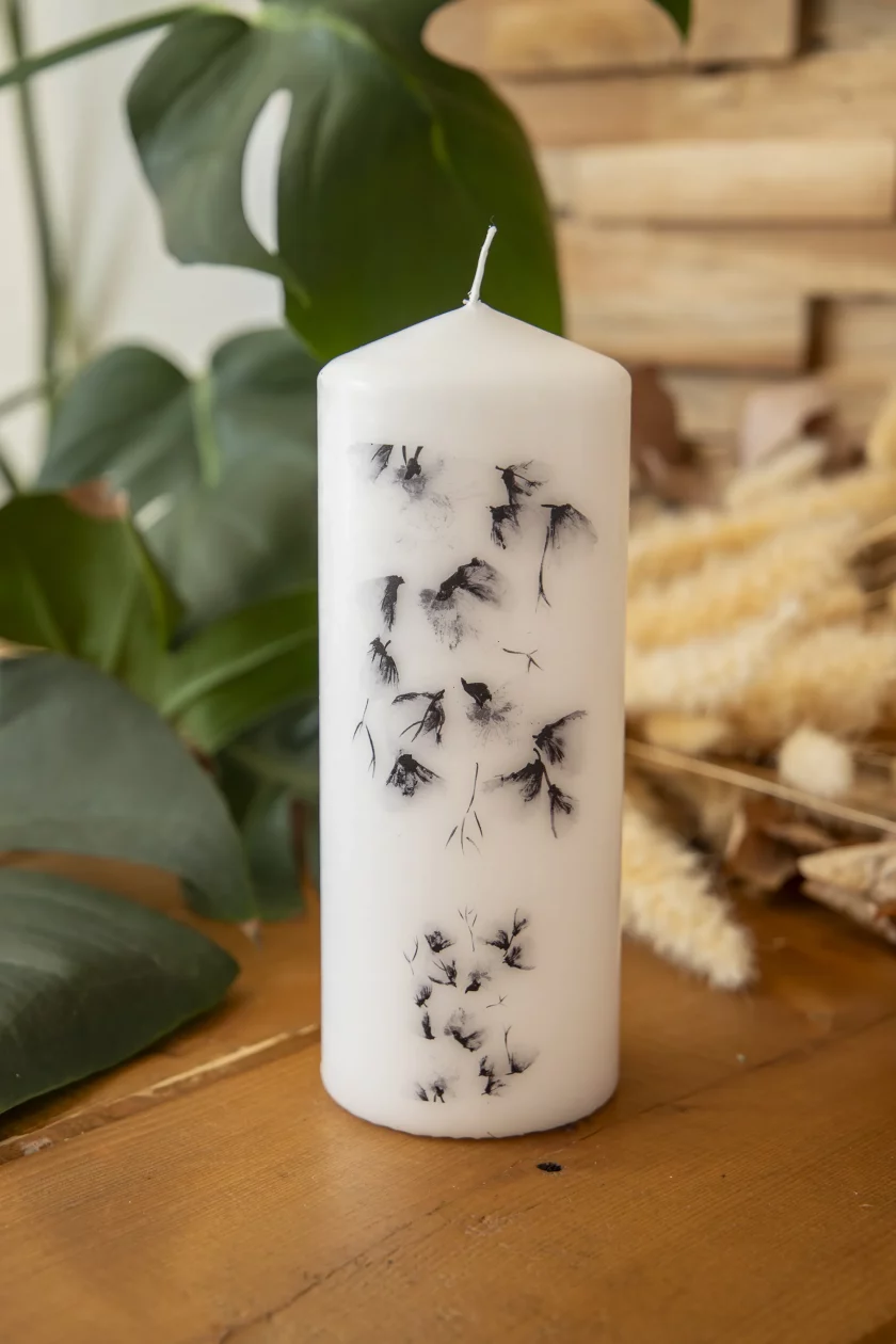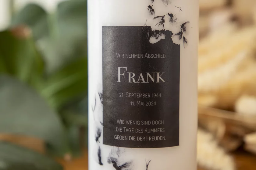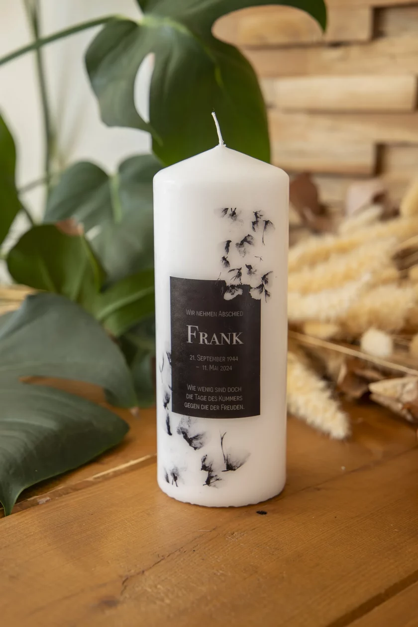 Die “Black Stamp” Trauerkerze ist eine würdige und stilvolle Art, sich an einen geliebten Menschen zu erinnern und Trost in Zeiten des Abschieds zu spenden. Diese Kerze zeichnet sich durch ihr schlichtes, elegantes Design aus, das durch ein dezentes schwarzes Stempelmuster auf weißem Hintergrund akzentuiert wird. Das minimalistische Design spricht für sich und vermittelt eine ruhige, respektvolle Atmosphäre.